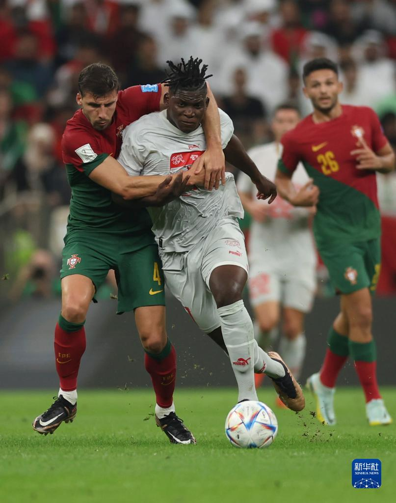 12月6日,瑞士隊球員恩博洛(前右)與葡萄牙隊球員魯本·迪亞斯(前左)在比賽中拼搶。新華社記者潘昱龍攝