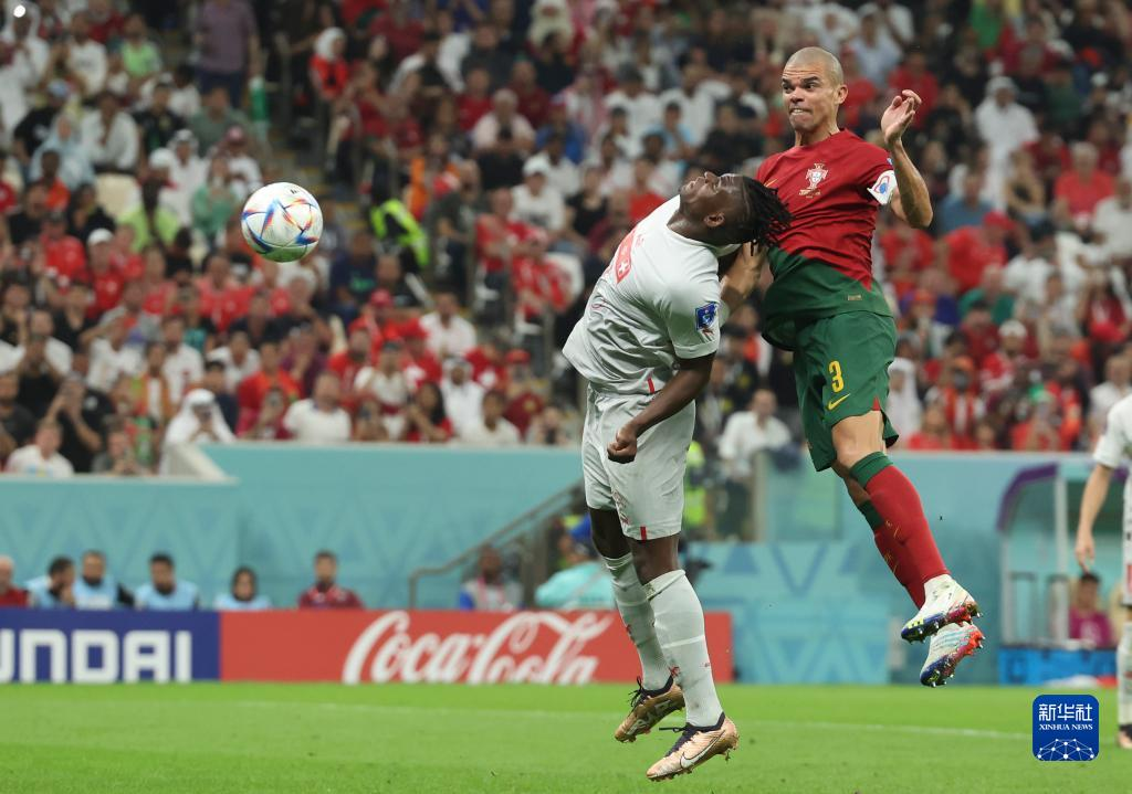 12月6日,葡萄牙隊球員佩佩(右)與瑞士隊球員恩博洛在比賽中爭頂。新華社記者韓岩攝