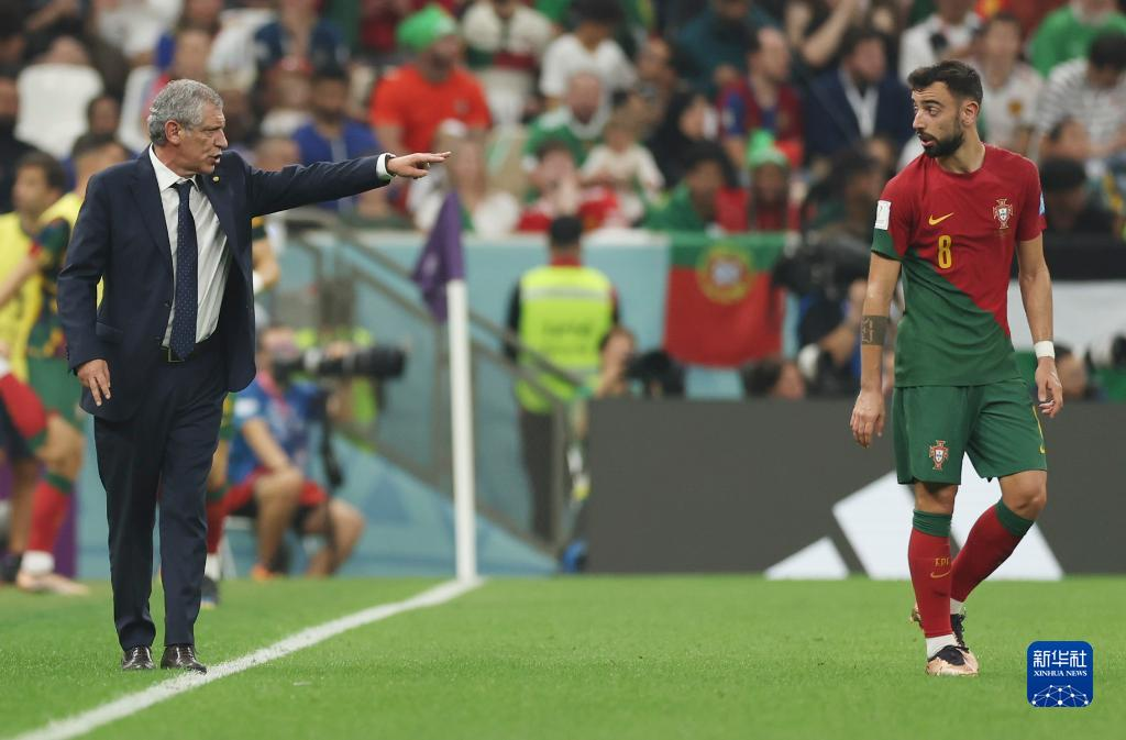 12月6日,葡萄牙隊總教練費南多·桑托斯(左)在場邊指揮。新華社記者潘昱龍攝
