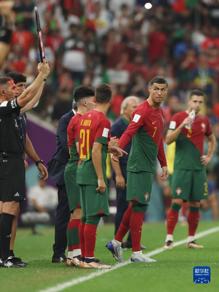 12月6日,葡萄牙隊球員克羅納爾多(右二)在比賽中準備替補上場。新華社記者潘昱龍攝