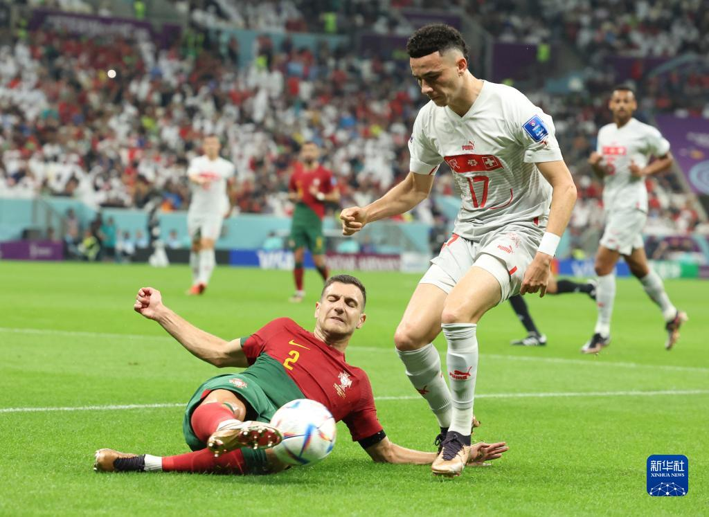 12月6日,葡萄牙隊球員若昂·菲利克斯(左)與瑞士隊球員索烏在比賽中拼搶。新華社記者潘昱龍攝